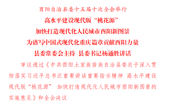全会审议通过《中共酉阳土家族苗族自治县委关于深入贯彻落实习近平总书记重要讲话重要指示精神 高水平建设现代版“桃花源” 加快打造现代化人民城市酉阳新图景的实施意见》和《中国共产党酉阳土家族苗族自治县第十五届委员会第十次全体会议决议》。