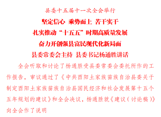 县委常委会主持会议。县委书记杨通胜讲话并就《中共酉阳土家族苗族自治县委关于制定酉阳土家族苗族自治县国民经济和社会发展第十五个五年规划的建议(讨论稿)》向全会作了说明,县委副书记、县长陈政出席。
