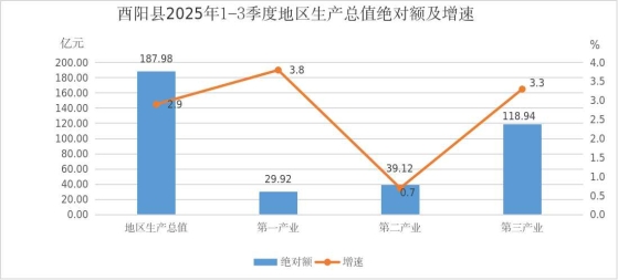 1-3季度,全县实现地区生产总值187.98亿元,增长2.9%。其中,第一产业增加值29.92亿元,增长3.8%;第二产业增加值39.12亿元,增长0.7%;第三产业增加值118.94亿元,增长3.3%。