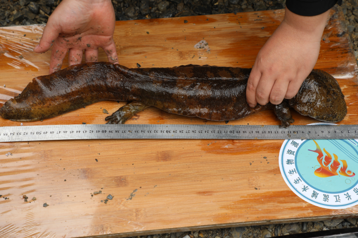 5月6日,县农业农村委在生态资源普查工作过程中,在三黛沟大鲵自然保护区意外发现一条重1.42千克、体长56公分的野生娃娃鱼并将其安全送回自然栖息地。