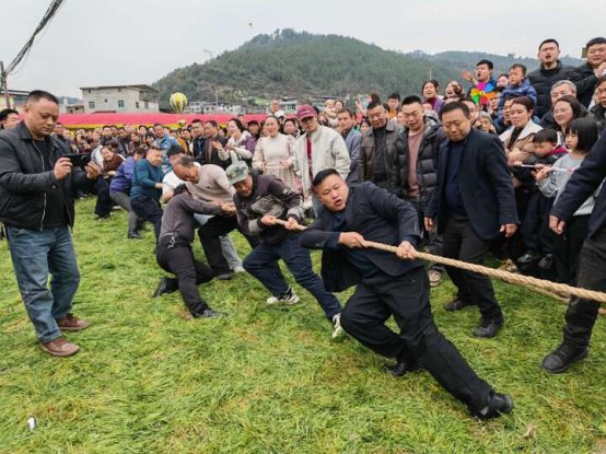 花海边的趣味运动会上,拔河、挑脐橙接力、蒙眼敲锣、抓猪游戏等项目,吸引众多村民与游客踊跃参与,现场呐喊声与欢笑声交织不断。“今天带孩子来玩,既能赏花又能运动,很开心。”游客张先生表示。