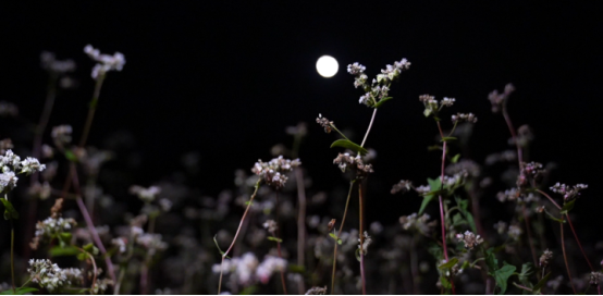 与此同时,在后坪乡的月夜之下,另一场视觉盛宴正在悄然上演。月光如水银般倾泻在荞麦花田,原本粉白的花海瞬间化为一片流动的银波。每一朵五瓣星形的小花轮廓清晰,宛如碎玉洒落大地。清风徐来,花穗轻摇,空气中浮动着植物特有的清香。荞麦花与月光相映成趣,生动诠释了白居易笔下“月明荞麦花如雪”的千古诗意。