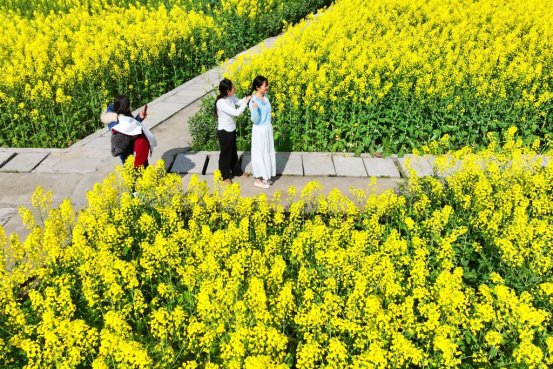 从空中俯瞰,油菜花田宛如大地铺就的金色地毯,田垄阡陌纵横,将金色的花海分割成整齐的方块,呈现出别具一格的几何美感。在花田深处,不少游客沿着步道漫步其中,穿梭在金黄的花海间,用镜头定格春日的美好。微风拂过,花浪起伏,空气中弥漫着淡淡的花香,让人沉醉其中。