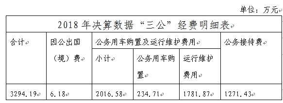 经汇总, 2018年度县本级 “三公”经费3294.19万元,其中:因公出国(境)费6.18万元、公务用车购置及运行维护费2016.58万元(其中:公务用车购置费234.71万元、公务用车运行维护费1781.87万元)、 公务接待费1271.43万元。