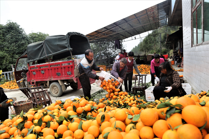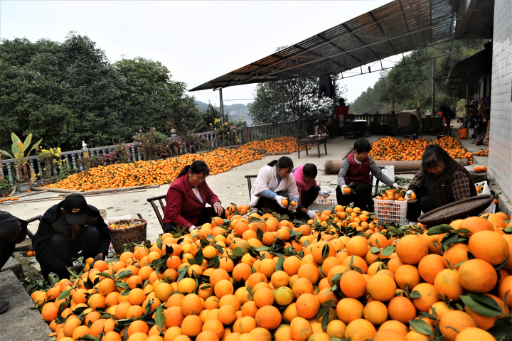 11月29日,记者在酉酬镇古田村5组一户农家院坝看到,一车车刚从树上采摘下来的脐橙陆陆续续运往院坝,十多名村民正在分拣堆积如小山的脐橙。