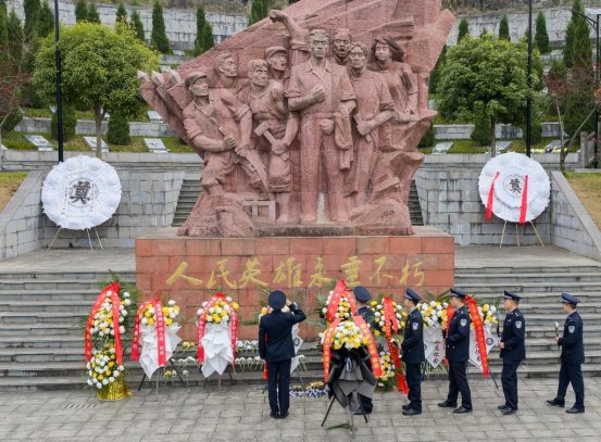 下午3时,在县烈士陵园,全体民警代表整齐列队,来到革命烈士纪念碑前,向革命先烈敬礼。随后,两名民警手抬花篮缓步上前,向烈士敬献花篮,缎带上“革命烈士永垂不朽”的金色字样格外醒目。全体人员脱帽默哀,向革命先烈致以深切追思。默哀毕,大家依次缓步绕行纪念碑,敬献鲜花并敬礼瞻仰。