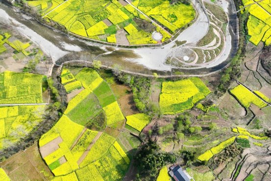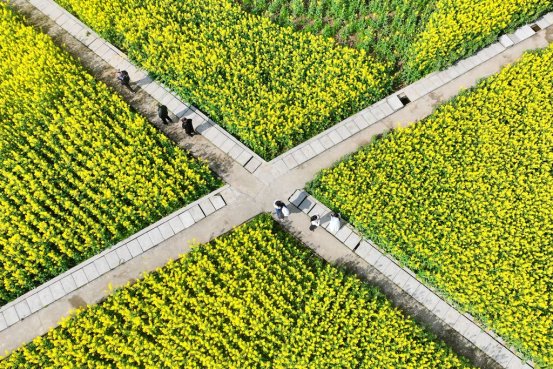 从空中俯瞰,油菜花田宛如大地铺就的金色地毯,田垄阡陌纵横,将金色的花海分割成整齐的方块,呈现出别具一格的几何美感。在花田深处,不少游客沿着步道漫步其中,穿梭在金黄的花海间,用镜头定格春日的美好。微风拂过,花浪起伏,空气中弥漫着淡淡的花香,让人沉醉其中。