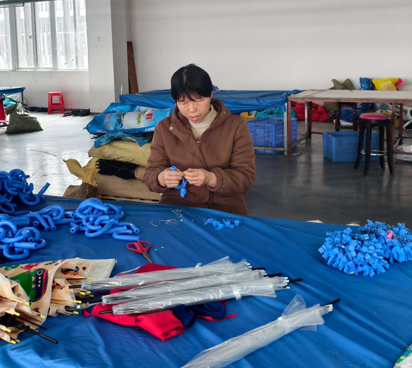 为确保订单按期交付,企业创新统筹调度模式,节前就完成人员排班、物料储备、设备检修等工作,节后员工返岗率达100%。依托“园区主阵地+乡镇生产点+到户加工岗”的成熟模式,企业将伞骨组装、伞面缝合等简易工序下沉至全县20多个乡镇的39家加工点,实现总部研发生产与乡镇加工点协同发力,日产雨伞量较去年同期提升20%。2025年,该企业年产值达1.68亿元,带动数千名群众在家门口实现就业增收。